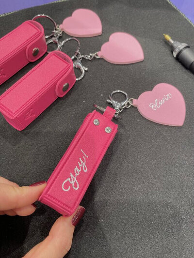 Hot foiling uses a heated, hand-held tool to press metallic foil onto a surface, typically leather, faux leather, or ribbon. I begin by writing or drawing directly onto the item with the tool, using a special foil sheet. The heat activates the foil, bonding it permanently to the surface in a shimmering, elegant design.